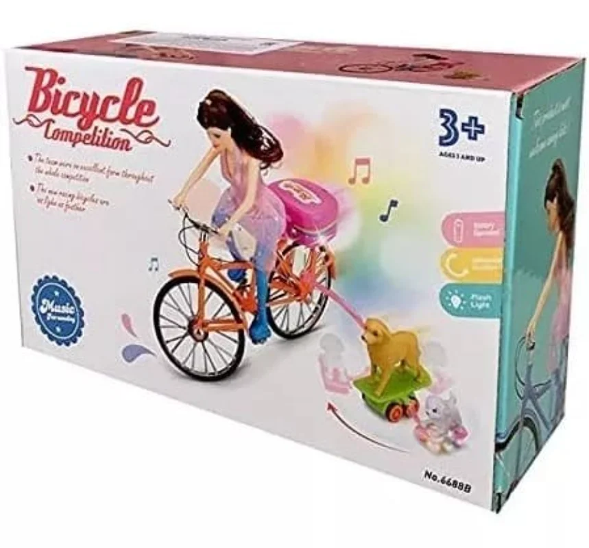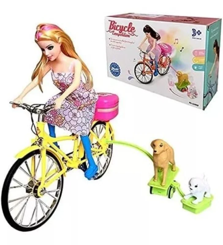 Boneca articulada de 22 cm de altura, com movimentos realistas enquanto pedala sua bicicleta.