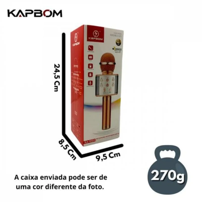 -Microfone Karaokê com conexão para rádio FM e Bluetooth, tem 5 tipos de mudança de voz, entrada para cartão micro SD, P2 e USB.