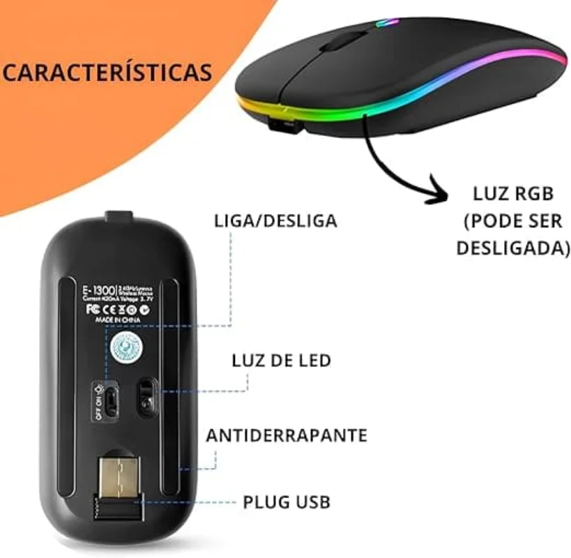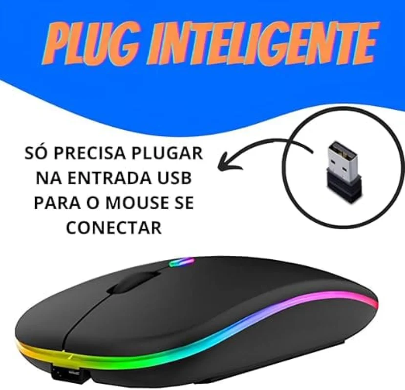 A conexão RF 2,4GHz com receptor Nano USB garante resposta estável e rápida, com alcance de até 10 metros. Além disso, o ajuste de DPI 800/1200/1600 permite escolher a sensibilidade ideal para tarefas do cotidiano, navegação e uso em escritório. O visual RGB dá um toque moderno ao seu setup.